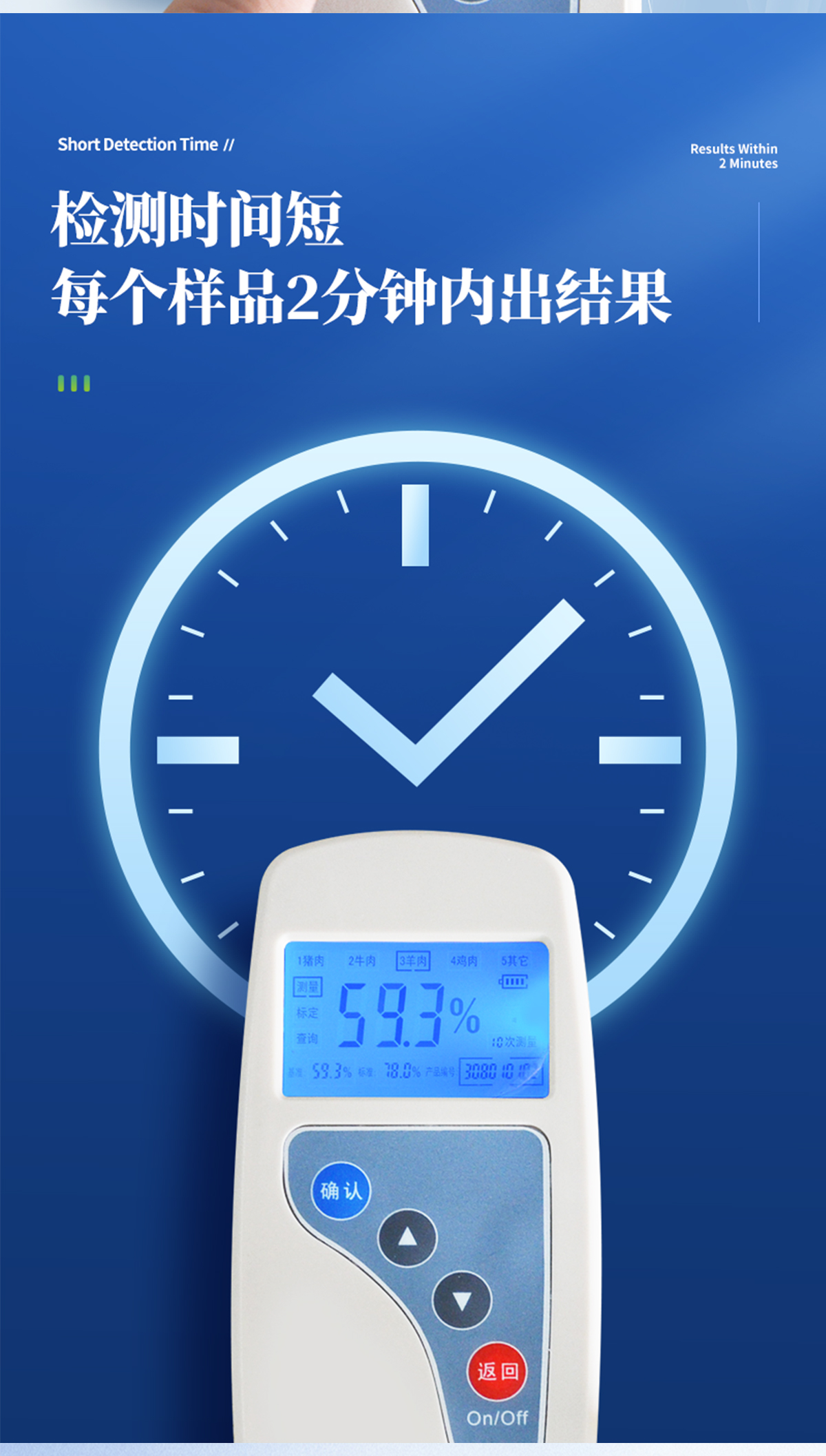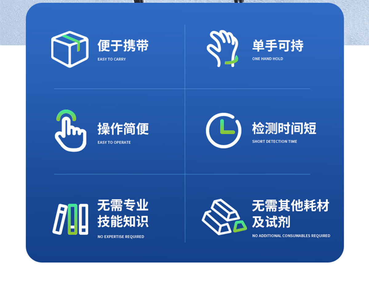 | 便于攜帶,單手可持 | 可根據(jù)測定對象的品種,設(shè)定相應(yīng)的判斷標(biāo)準(zhǔn)值 | 操作簡便,檢測人員無需專業(yè)技能知識 | 檢測時間短,每個樣品2分鐘內(nèi)出結(jié)果; | 檢測試驗無需其他耗材及試劑 |