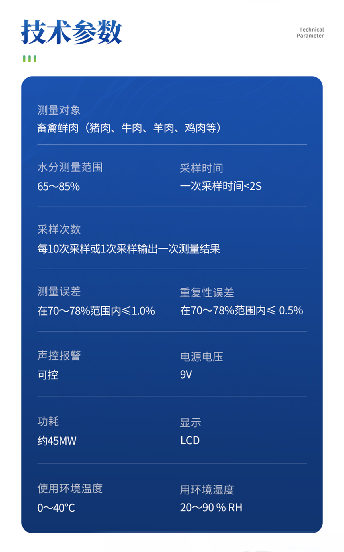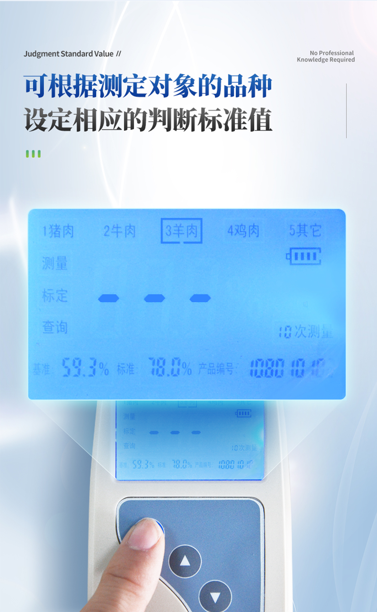 | 畜禽鮮肉(豬肉、牛肉、羊肉、雞肉等) | 65~85% | 一次采樣時間< 1s | 每10次采樣或1次采樣輸出一次測量結(jié)果 | 在70~78%范圍內(nèi)≤1.0% | 在70~78%范圍內(nèi)≤ 0.5% | 超標(biāo)報警 | 可設(shè)定每個品種的判斷標(biāo)準(zhǔn)。 | 交直流兩用 | 觸摸式按鍵 | 45mW | 167×70×30mm | 藍(lán)色背光LCD | 0~40℃ | 20~90 % RH | USB接口 |