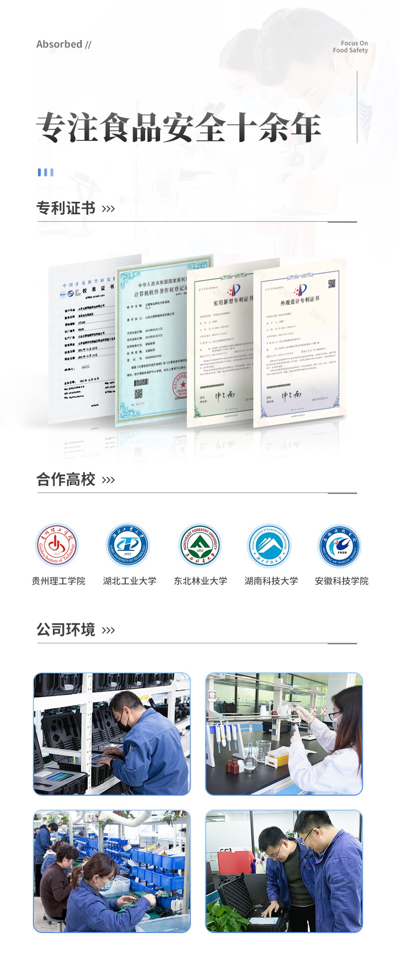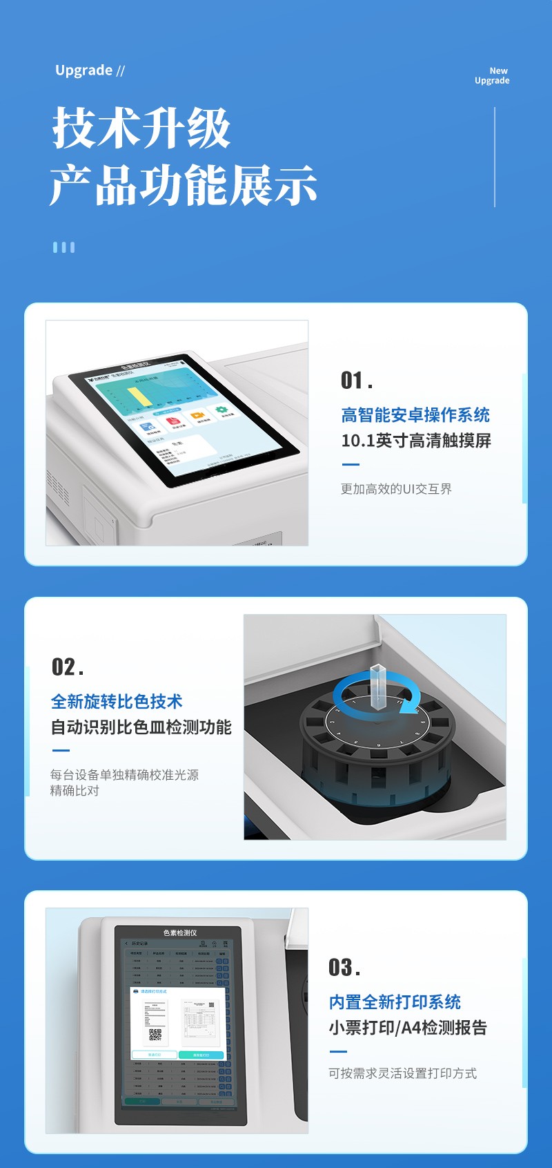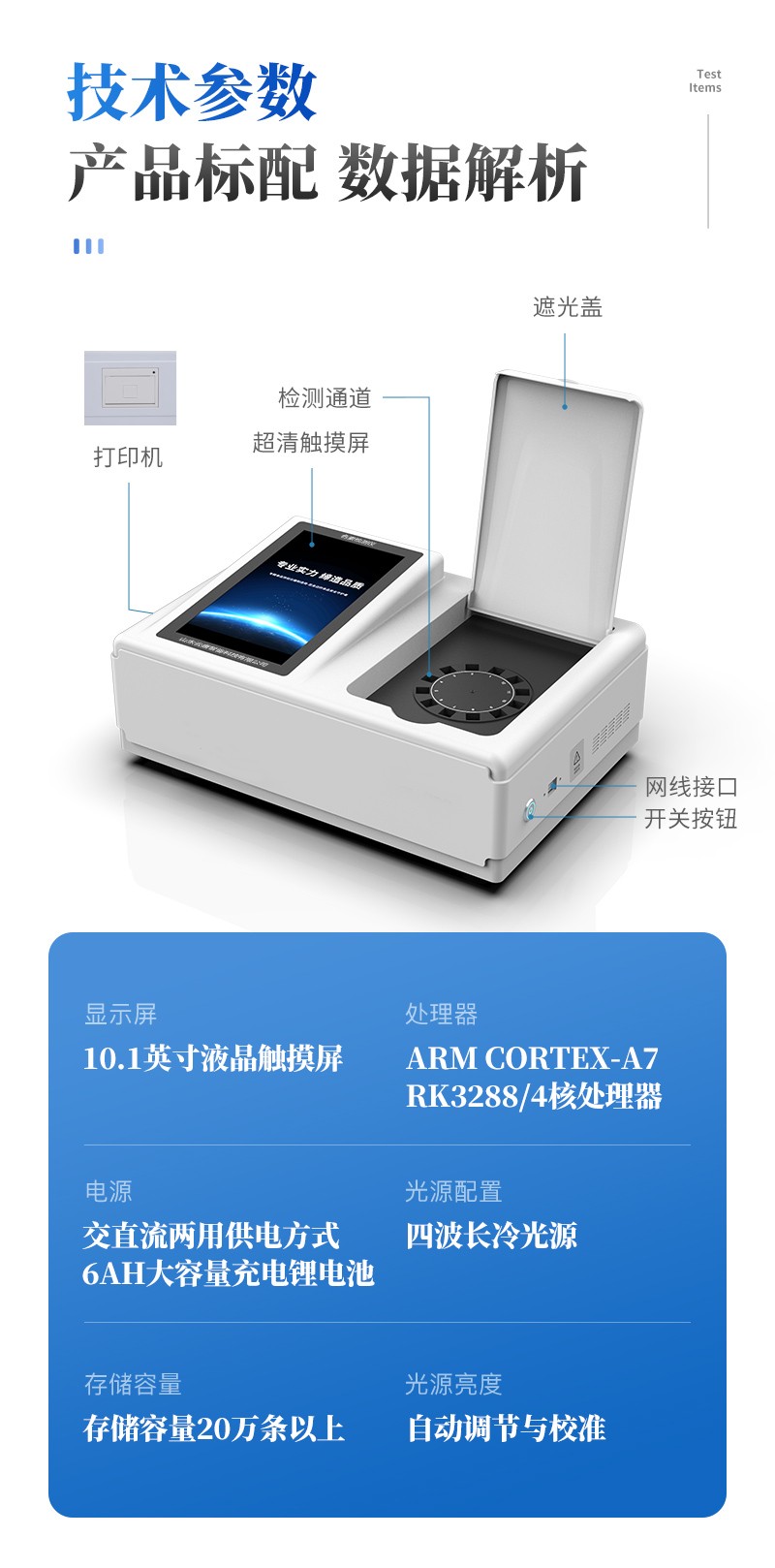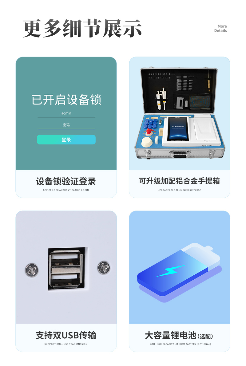 | 儀器采用臺(tái)式一體化系統(tǒng)檢測(cè)技術(shù),將分光光度模塊、新型農(nóng)殘檢測(cè)模塊、數(shù)字化管理模塊、無(wú)線(xiàn)通訊模塊高度集成于一體,支持檢測(cè)200種食品安全檢測(cè)項(xiàng)目,同時(shí)預(yù)留升級(jí)檢測(cè)方法。 | 儀器檢測(cè)模塊標(biāo)準(zhǔn)化、智能化,可隨意自由組合。檢測(cè)箱體內(nèi)置多個(gè)標(biāo)準(zhǔn)檢測(cè)單元,檢測(cè)模塊可以調(diào)整配置。 | 儀器采用全新安卓智能系統(tǒng),主控芯片采用 ARM Cortex-A7,RK3288/4核處理器,10.1寸高清液晶觸摸豎屏,更加**的UI交互界面,運(yùn)轉(zhuǎn)快捷;儀器配備無(wú)線(xiàn)通信模塊: 4G(APN)通訊模塊、Wifi模塊,藍(lán)牙傳輸,同時(shí)具有雙USB接口以及RJ45接口能以多種方式實(shí)現(xiàn)數(shù)據(jù)保存和數(shù)據(jù)傳輸功能。 | 創(chuàng)新檢測(cè)模式: | ★檢測(cè)通道:≥12通道;采用精密旋轉(zhuǎn)比色池設(shè)計(jì),使用同芯片同光源校準(zhǔn)精度,解決不同光源之間的誤差值。1-12通道間誤差0.1%。(**號(hào):ZL202022821055.2) | ★儀器具有自動(dòng)識(shí)別比色皿檢測(cè)功能,即:將樣品比色皿放入儀器后,點(diǎn)擊樣品檢測(cè),儀器自動(dòng)識(shí)別比色皿進(jìn)行通道檢測(cè)。 | 進(jìn)口高精光源: | 高精度進(jìn)口四波長(zhǎng)冷光源,通道配置 410、520、590、630nm 波長(zhǎng)光源,一個(gè)光源芯片驅(qū)動(dòng)一個(gè)光源,誤差極小,每臺(tái)設(shè)備單獨(dú)**校準(zhǔn)光源,**比對(duì),同時(shí)參照四種不同波段光源全方位覆蓋市面上99%的農(nóng)殘食品項(xiàng)目檢測(cè)。 | 智能化操作系統(tǒng): | 便捷操作系統(tǒng):設(shè)備檢測(cè)時(shí)可在同一檢測(cè)界面自動(dòng)對(duì)應(yīng)相關(guān)檢測(cè)通道一次性選擇1-12個(gè)樣品名稱(chēng),無(wú)須退出界面,節(jié)省操作時(shí)間。 | 數(shù)據(jù)集成系統(tǒng):設(shè)備首頁(yè)自動(dòng)統(tǒng)計(jì)檢測(cè)數(shù)據(jù)包含:周檢測(cè)數(shù)據(jù)、月檢測(cè)數(shù)據(jù),全部檢測(cè)總數(shù)量,均包含檢測(cè)總數(shù),合格數(shù),不合格數(shù),以及相關(guān)柱形分析圖,對(duì)各項(xiàng)檢測(cè)數(shù)據(jù)清晰掌握,無(wú)需電腦查詢(xún),更加快捷直觀(guān)。 | 項(xiàng)目預(yù)設(shè)系統(tǒng):支持添加單個(gè)及多個(gè)相同或不相同的任務(wù)預(yù)設(shè),一鍵快速調(diào)取,每一個(gè)任務(wù)分別可以設(shè)置不同的樣品、批次、編號(hào)、來(lái)源、備注、抽樣信息、檢測(cè)信息、受檢信息、復(fù)核信息等更多信息。無(wú)縫鏈接平臺(tái)和APP實(shí)時(shí)查看下發(fā)任務(wù)。 | 數(shù)據(jù)監(jiān)管系統(tǒng):同步對(duì)接監(jiān)管平臺(tái),數(shù)據(jù)可局域網(wǎng)和互聯(lián)網(wǎng)數(shù)據(jù)上傳,檢測(cè)結(jié)果可選擇直接傳至食品安全監(jiān)管平臺(tái)。集成OSS輸出存儲(chǔ)服務(wù)、區(qū)分設(shè)備定向管理應(yīng)用,進(jìn)行區(qū)域食品安全監(jiān)管及大數(shù)據(jù)分析處理與數(shù)據(jù)統(tǒng)計(jì),檢測(cè)區(qū)域食品安全長(zhǎng)短期動(dòng)態(tài),達(dá)到食品安全問(wèn)題預(yù)估、預(yù)警。 | 自定義打印系統(tǒng):內(nèi)置全新打印系統(tǒng),新創(chuàng)自定義打印方式,可按需靈活設(shè)置開(kāi)啟或關(guān)閉:產(chǎn)品合格證(國(guó)家農(nóng)業(yè)部標(biāo)準(zhǔn)要求),二維碼,抽樣信息、檢測(cè)信息,受檢信息、復(fù)核信息、抽樣日期、檢測(cè)日期等信息的打印。 | 系統(tǒng)遠(yuǎn)程更新功能:可定向分客戶(hù)分儀器更新系統(tǒng),按照不同客戶(hù)后期實(shí)際需求添加項(xiàng)目,無(wú)需機(jī)器返廠(chǎng),即可遠(yuǎn)程實(shí)時(shí)升級(jí)全新系統(tǒng),節(jié)省時(shí)間成本及避免運(yùn)輸造成設(shè)備損壞。 | 儀器主機(jī)采用一體化防水、抗壓、防撞擊、防腐蝕箱體設(shè)計(jì),同時(shí)配備交直流供電,可連接車(chē)載電源,可選配大容量充電鋰電池,滿(mǎn)足現(xiàn)場(chǎng)野外檢測(cè)需求。 | 安全證書(shū),放心保障:儀器具有中國(guó)計(jì)量科學(xué)研究院校準(zhǔn)證書(shū),**認(rèn)證。 |